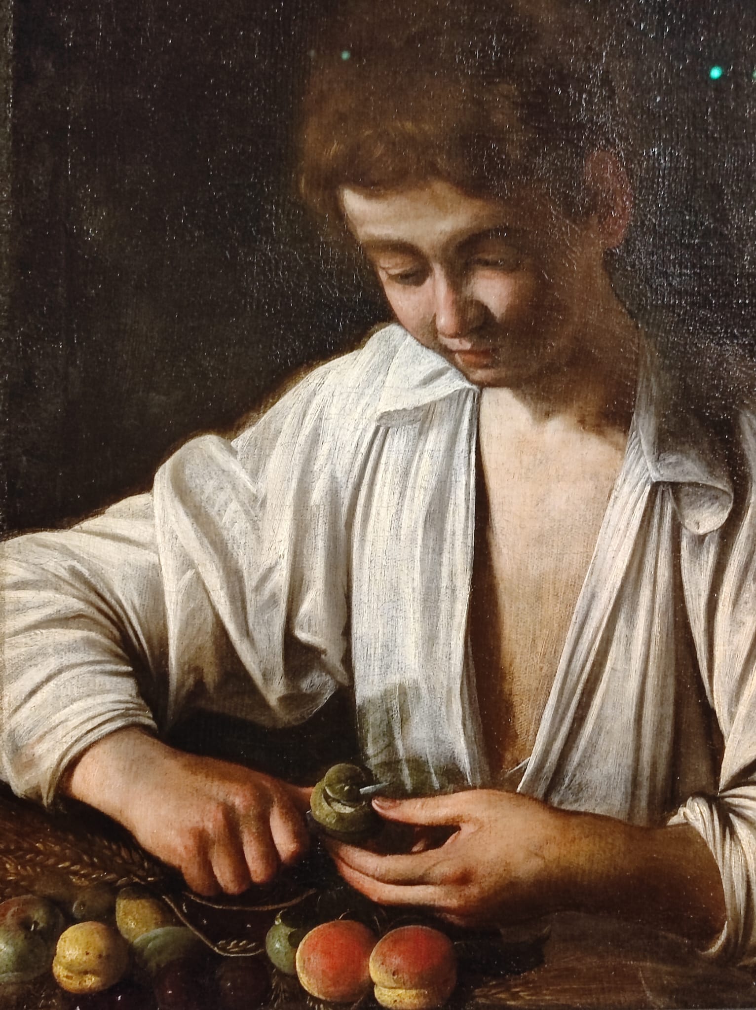 Mi ha colpito, tra le opere, una delle prime in mostra, quindi appartenente agli anni giovanili, in cui però c’è già tantissimo del Caravaggio maturo: è il cd Mondafrutto, un giovane intento a sbucciare un frutto, davanti a sé pesche mature ritratte in maniera esemplare. Ma ciò che più mi colpisce del giovinetto sono le mani, così realistiche nella resa delle nocche, nella posa naturalissima delle dita, da sembrare quasi di vederle muoversi. Stupendo.