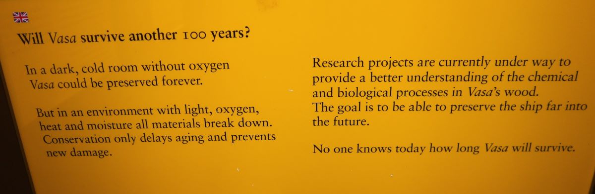 Altra sezione che mi ha particolarmente colpito – anche se decisamente poco spettacolare – è quella relativa ai restauri che è introdotta però da un tema non di poco conto: quello del riscaldamento climatico, della sostenibilità ambientale e museale e della necessità, quindi, di monitorare costantemente lo stato di salute dei legni, intervenendo non appena si incontrano segni di deterioramento. Lavorando al Museo delle Navi di Fiumicino, conosco bene il tema e so quanto sia impegnativo in termini economici e di ricerca: anche un restauro sbagliato condotto in passato – quando le conoscenze sul trattamento del legno antico e bagnato erano molto scarse – può compromettere per sempre i resti lignei. Ma non solo, il Vasa Museet va oltre, si pone una domanda e non ha paura di ipotizzare la risposta: stanti le condizioni climatiche e di fruizione attuali, quanto potrà sopravvivere ancora il relitto del Vasa fuori dal mare che l’ha custodito pressoché intatto per 333 anni?
