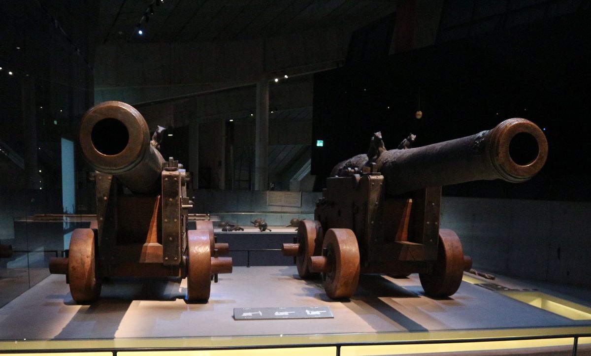 Ai piani superiori conosciamo la vita di bordo: oggetti dell’uso quotidiano, della dispensa, della cucina, della cambusa; le belle ceramiche della cabina del capitano; il calderone per il fuoco, le pentole e i piatti in ceramica dipinta; i boccali per la birra; e poi vestiti, scarpe e stivali; utensili da lavoro per le riparazioni; tutti quegli oggetti che sarebbero stati usati quotidianamente e che invece non uscirono mai dai cassetti nei quali erano stati riposti prima del varo. Al piano ancora superiore troviamo la ricostruzione di alcuni ambienti della nave e poi una sezione specifica sulle navi da guerra e sul tema, più ampio, delle battaglie navali: perché anche se il Vasa non andò mai in battaglia, era appunto dotato di una moltitudine di cannoni, di palle di cannone in proporzione, nonché di armi e armature per i soldati che si fossero mai trovati a doversi scontrare in una battaglia navale con un ipotetico nemico. Sono esposti due dei 64 cannoni di cui il Vasa era dotato, alloggiati su due carrelli a quattro ruote del peso di 300 kg. Immaginate la gioia per gli operai che li collocarono a bordo…