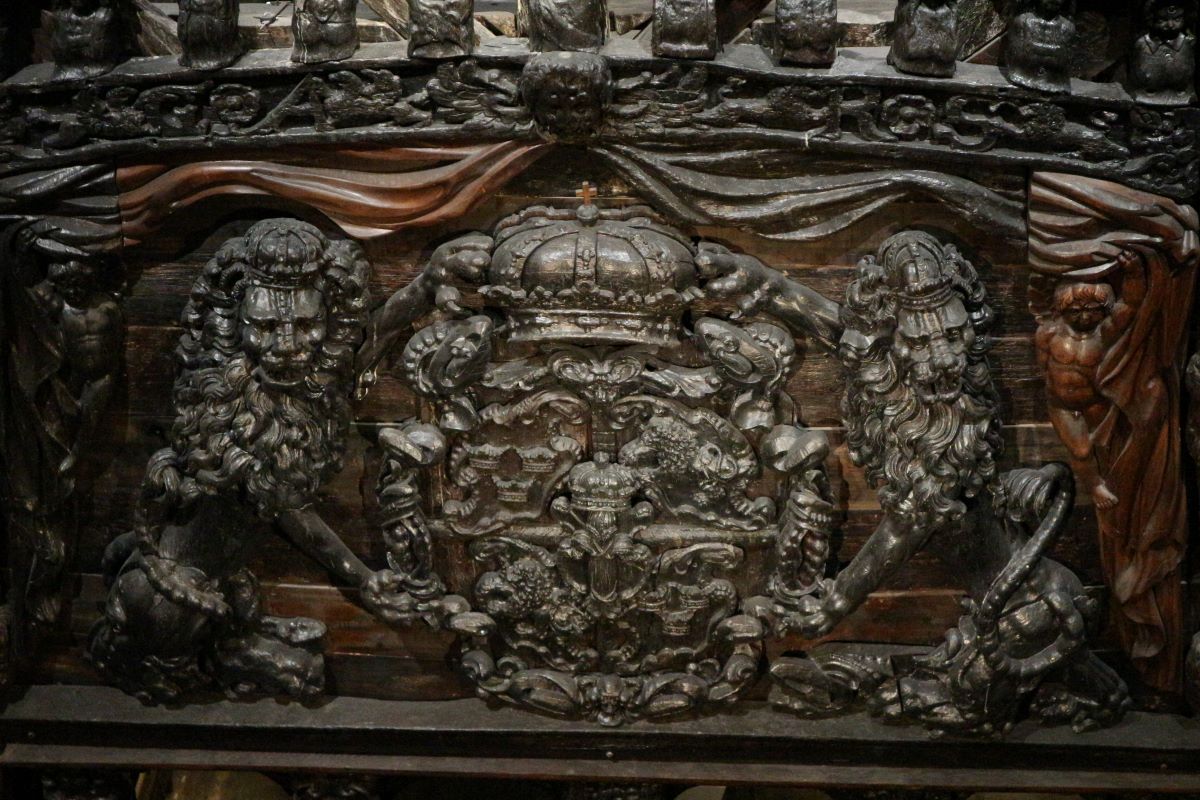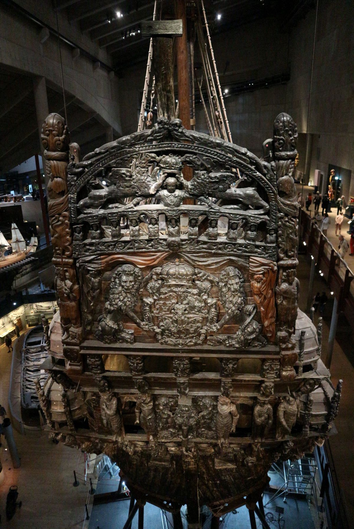 Le figure scolpite nel legno sono varie: c’è Ercole, il soldato romano con un cane che gioca con la testa di un leone, alcuni soldati romani e 19 imperatori romani (più Augusto, probabilmente, andato però perduto), per indicare che il Re di Svezia si identificava con essi. E poi maschere, maschere di ogni sorta, grottesche, volti di animali, leoni e altre figure mostruose e apotropaiche. Ma la cosa più grande e che doveva destare meraviglia è il grande stemma reale, sostenuto da due grossi e magri leoni rampanti e ruggenti. Una sovrabbondanza di decorazioni e sculture che seguiva uno schema iconografico ben preciso: l’esaltazione della Corona di Svezia, un messaggio politico importante soprattutto vista la situazione geopolitica di quegli anni (la Svezia entrerà ufficialmente in guerra nel 1630). A completare il programma iconografico e scultoreo il grande leone allungato sulla prua della nave, come una polena, a evocare Folkunga, il leone simbolo della monarchia svedese fin dal medioevo.