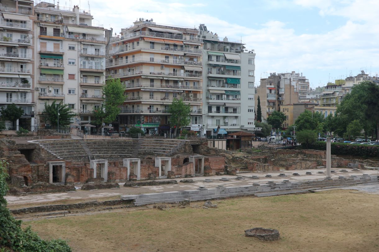 Platìa Aristotelou è una larga via pedonale culminante in un’ampia piazza antistante il waterfront di Salonicco. La lunga arteria discende dall’area archeologica dell’Agorà, cioè la piazza del foro di età romana con tutti gli edifici antichi annessi e connessi. Già dall’alto si capisce come era organizzata. A est si colloca l’Odeon; un colonnato lo separa dalla piazza del foro vera e propria, che a sua volta è sopraelevata rispetto a un criptoportico nel quale aprivano botteghe. La storia del sito in realtà è complessa, perché documenta una continuità di vita dalla fine del IV secolo a.C. ai giorni nostri.