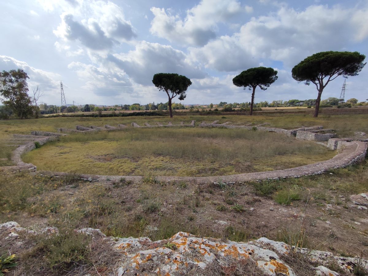 Poco distante, c’è l’anfiteatro. E siamo tutti abituati agli anfiteatri dalla canonica pianta ellittica. Qui invece abbiamo un anfiteatro a pianta perfettamente circolare. Il motivo non è chiaro. Ma la sua costruzione risale a un periodo in cui gli anfiteatri erano ancora innalzati in legno, per cui non esisteva una pianta canonica. Inoltre, anche la necessità di sfruttare l’orografia presente può aver giocato un ruolo. Così a Lucus Feroniae ci troviamo davanti a un anfiteatro circolare, esemplare più unico che raro.