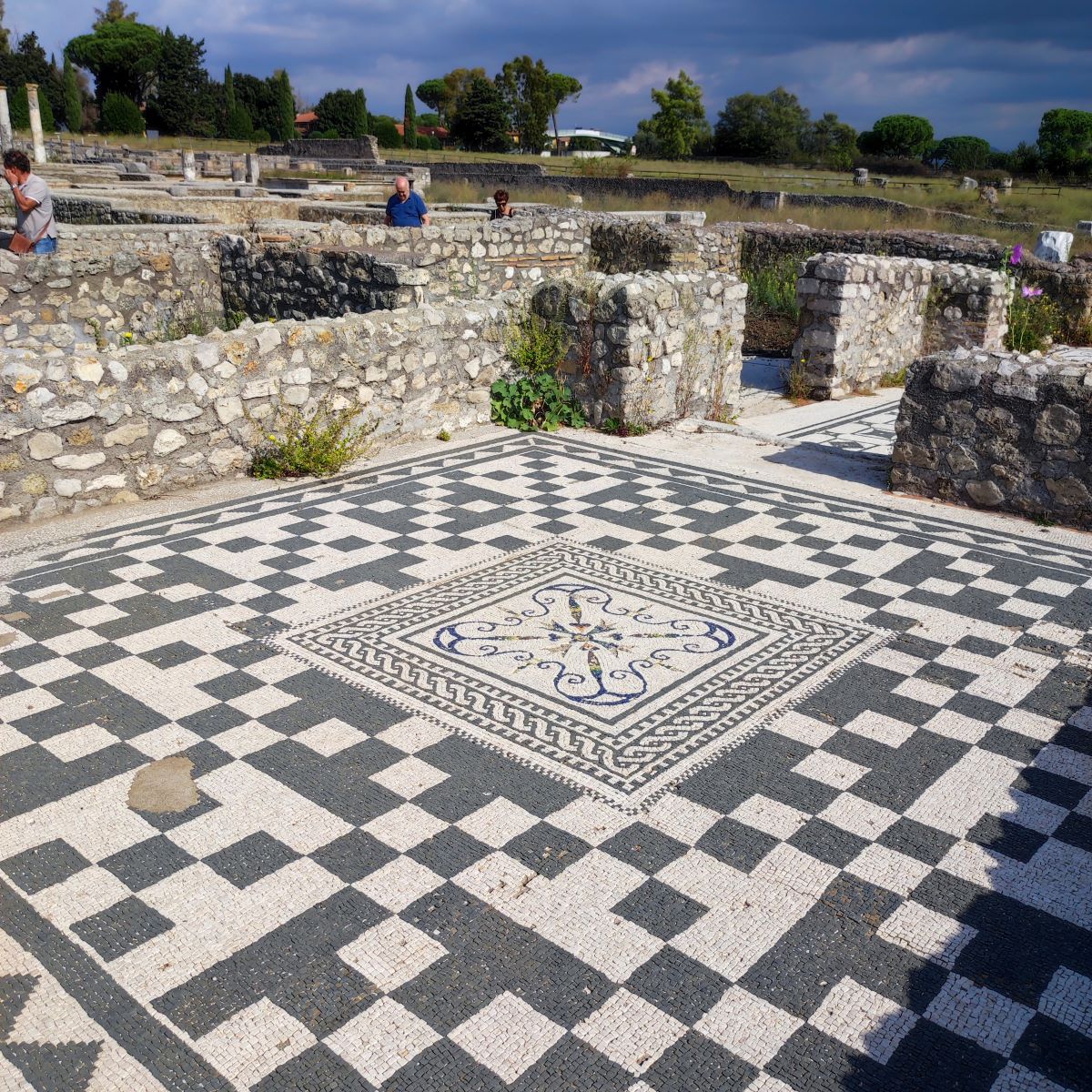L’Augusteo, invece, non porta in alcun modo il nome degli Egnatii, ma solo quello dei Volusii Saturnini, in particolare di Lucio, console nel 12 a.C. e nel 3 d.C., console dunque accanto all‘imperatore. Proseguiamo la visita della città, lasciandoci alle spalle i luoghi del potere. Incontriamo alcune taberne e domus dai bei pavimenti a mosaico o in piastrelle esagonali. Sembra di stare nella mia cameretta da bambina: non sto scherzando: anche il pavimento della mia camera aveva mattonelle esagonali. Quelle di Lucus Feroniae sono però in marmo e il loro posizionamento intarsiato ad altri marmi policromi, ne fa un pavimento davvero elegante. I pavimenti a mosaico delle domus di Lucus Feroniae invece sono a soggetto geometrico o con eleganti girali vegetali.