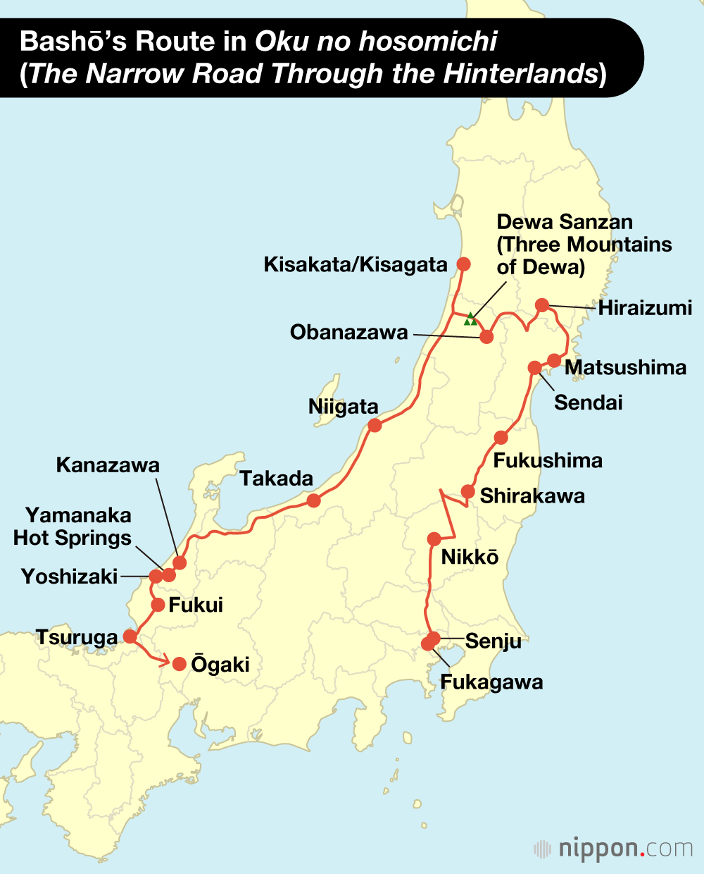 Il viaggio risale al 1684, ma viene pubblicato nel 1694 col titolo giapponese Oku no hosomichi. Il viaggio parte da Fukagawa (Tokyo) dove Bashō aveva la sua dimora col banano, a marzo, e risale l’isola fino a raggiungere Ogaki nella prefettura di Gifu alla fine di agosto. Un viaggio molto lungo, di circa 2400 km coperti in 150 giorni: praticamente dai 30 ai 40 km al giorno a piedi. Dal racconto di Bashō sappiamo che talvolta, grazie all’ospitalità di chi incontravano, è stato loro prestato un cavallo, il che ha decisamente aiutato, ma certo questa non è stata la regola. All’epoca, d’altra parte, si viaggiava a piedi o a cavallo, se si possedeva. Viaggio impegnativo, perché esposto alle intemperie, e pericoloso, perché il rischio di predoni era latente. Bashō e il suo allievo Sora fortunatamente non incappano in nessuna disavventura – almeno stando al racconto – ma che il viaggio in alcuni tratti sia duro si percepisce chiaramente, nonostante la prosa sempre poetica, mai dura, che tutto edulcora e tutto rende godibile.