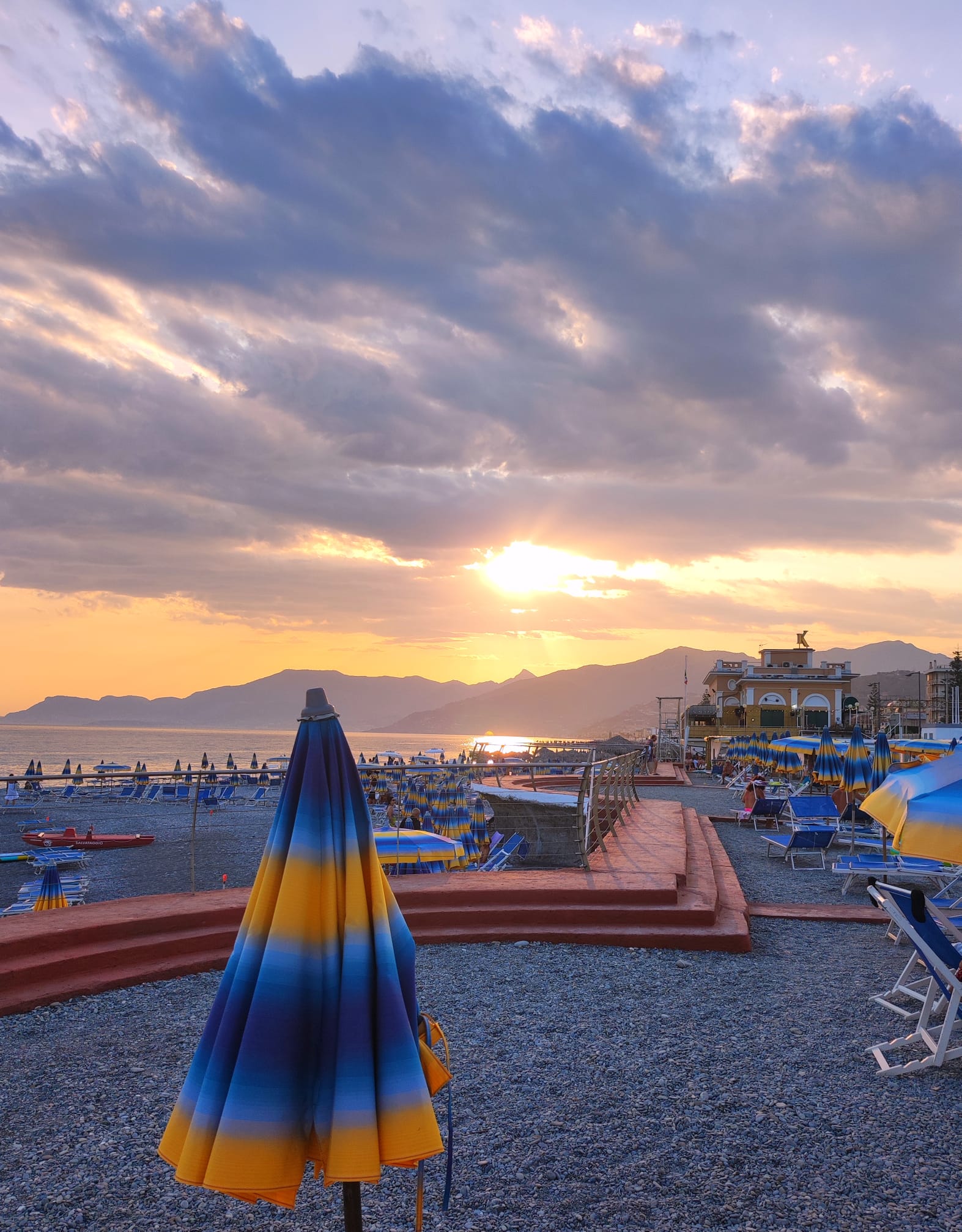 Ombrelloni in spiaggia a Bordighera, mentre tramonta il sole dietro il confine francese