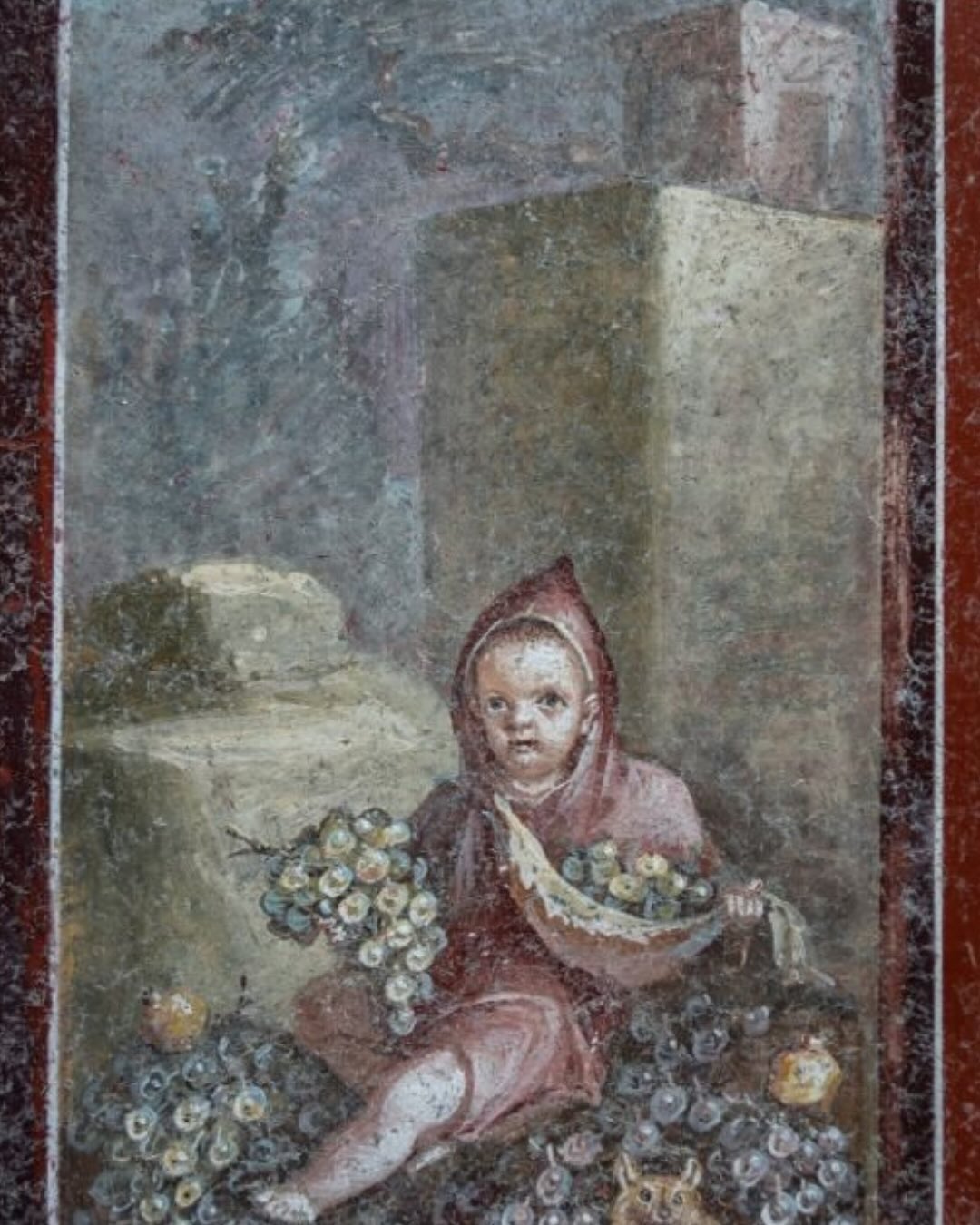 Essendo area di cantiere e di studi in corso qui non è consentito fotografare, né scendere al livello dei pavimenti degli ambienti, ma si può solo vedere dall’alto. Pertanto può sfuggire alla vista l‘affresco del Genius Cucullatus, un bimbo col capo coperto da un cappuccio e che assume un significato un po’ particolare: il bambino coperto da mantello e cappuccio, infatti, sta a rappresentare nel mondo romano la soglia tra la vita e la morte. In questo caso il bambino, che avrà al massimo due o tre anni, è raffigurato accanto a frutti, come il melograno e l’uva, che hanno fatto pensare al fatto che si tratti del figlio dei proprietari della casa, prematuramente scomparso, e fatto raffigurare sulla parete dell’abitazione, quale genio protettore della famiglia. Un pensiero dolcissimo e terribile allo stesso tempo, che dopo 2000 anni circa è tornato alla luce con tutta la sua potenza emotiva.