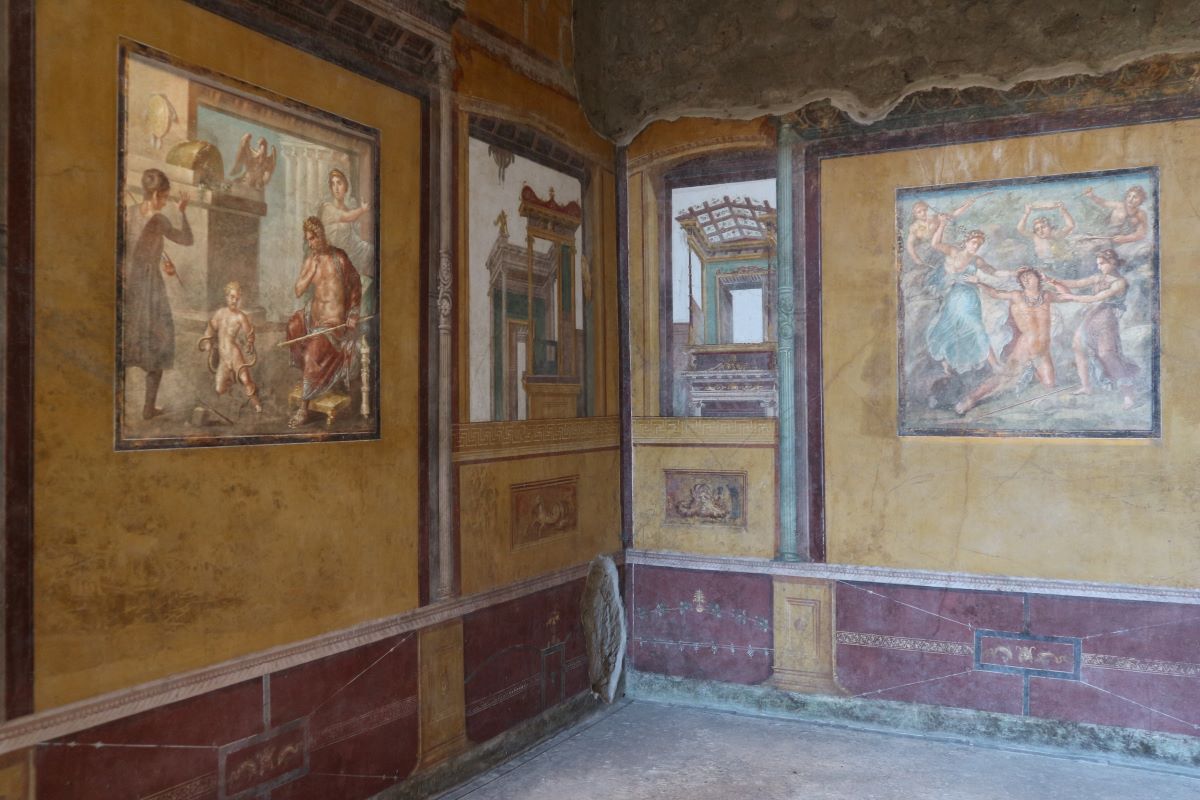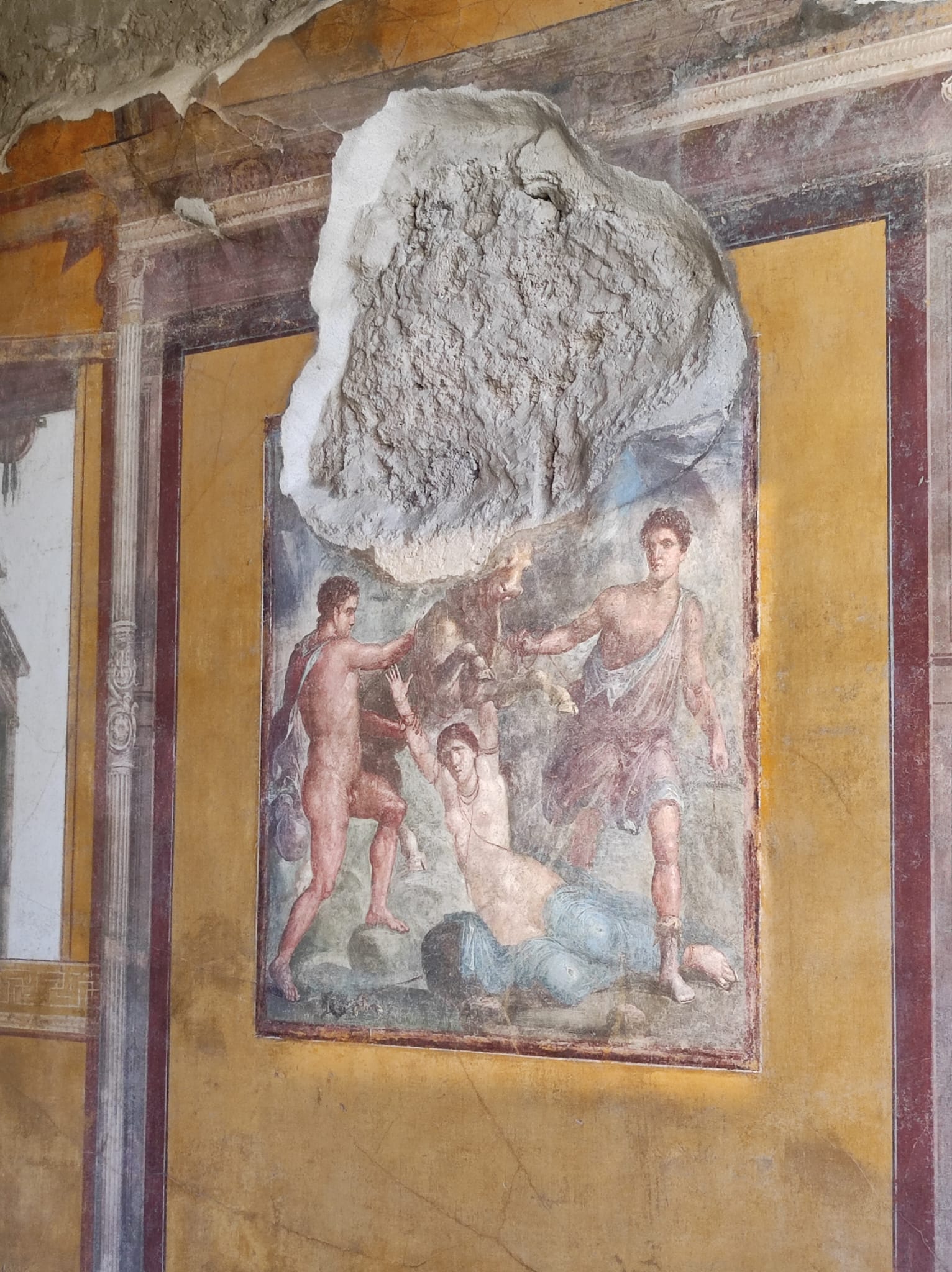 Oddio, ho detto che l’oecus è l’ambiente più bello. Ma che dire dei due ambienti nei quali ricorrono, su ciascuna delle tre pareti, altrettanti quadri che raccontano miti più o meno noti e che rivelano l’evidente alto livello culturale del committente nonché proprietario della casa? In un ambiente abbiamo nella stessa stanza Ercole bambino che uccide i serpenti inviatigli da Giunone per ucciderlo, lei che vuole indirettamente punire Giove, padre del bambino, per il tradimento (l’ennesimo, tra l’altro); Penteo, re di Tebe, assalito e ucciso dalle Baccanti perché si era opposto all’intriduzione del culto di Dioniso, dio dell’ebbrezza e del vino, nella città; e poi c’è l’efferato supplizio di Dirce, mito molto complesso nel quale la protagonista, Dirce, colpevole di aver tramato contro la figliastra, cerca di mettere contro i figli legittimi la vera madre salvo poi fare la stessa fine, cioè essere squartata, legata a un toro in corsa. Un mito, quello di Dirce, che ci racconta quanto il Patriarcato sia così connaturato nelle nostre vicende quotidiane, da risalire così indietro nel tempo ed essere giustificabile: in questo mito abbiamo infatti una giovane che suo malgrado è posseduta da Zeus e per questo abbandonata dal padre a vivere di stenti. Lei partorisce due bimbi che affida a un pastore. Solo dopo molti anni Zeus si ricorda di aver comportato qualche disgrazia alla fanciulla, sicché si fa vivo. Ma la situazione probabilmente è peggiorata, perché moglie del padre della giovane è Dirce, per l’appunto; donna estremamente intelligente e caparbia che sa che, se vuole mantenere il suo potere e i suoi privilegi, deve far fuori l’antagonista. Ecco che Dirce arriva sul monte e quasi convince due giovani ragazzi che quella donna che si aggira tra di loro va uccisa, legata a un toro imbizzarrito che se la porti via. I due giovani restano spiazzati: non sanno quale sia la verità, ma a un certo punto capiscono. E legano Dirce al toro. E sarà Dirce a fare la fine che aveva progettato per la sua giovane e inerme consanguinea.