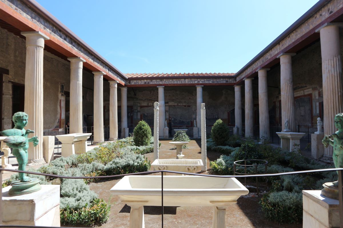 Aperta in anni recenti – post covid – al pubblico, questa domus è davvero una sorpresa. Deve il nome ai suoi due cubicoli – piccoli ambienti privati – decorati sulle tre pareti con il tema della pittura di giardino. Cosa si intende con pittura di giardino? Si tratta di un motivo decorativo molto elegante ed esuberante che evoca sulle pareti un giardino lussureggiante, in cui non solo le piante, gli alberi carichi di frutti, i fiori variopinti, riempiono lo spazio, ma anche anche gli animali che si possono incontrare in un giardino: uccellini, ma anche lucertole e serpenti. E poi ci sono gli arredi, che in questo caso sono statuette di divinità egizie, il che fa pensare che il proprietario della casa fosse devoto a Iside.