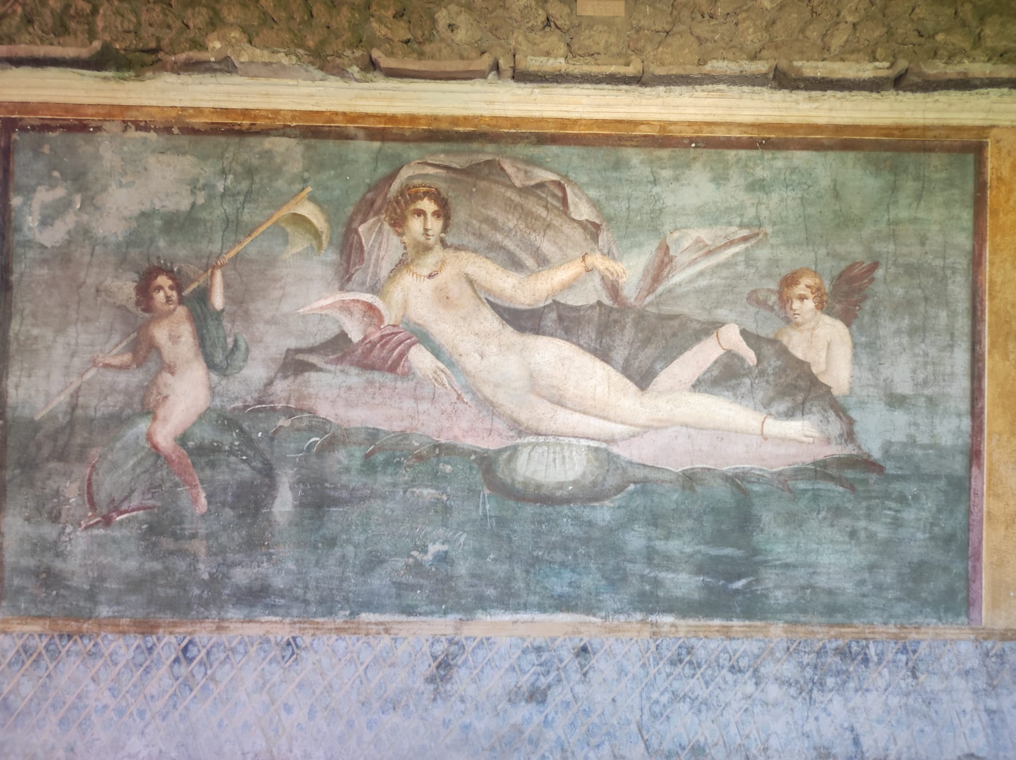 Naturalmente non è il giardino la cosa più eclatante di questa casa. Piuttosto, è quella Venere che davvero sta in una conchiglia, a simboleggiare il momento della nascita della dea dalla spuma del mare. L’affresco occupa l’intera parete di fondo del giardino della domus e si compone di tre pannelli: in quello centrale c’è per l’appunto Venere nella conchiglia, semisdraiata e con una gamba innaturalmente piegata. Nel complesso però diciamo che questo difetto si perde, perché l’affresco è davvero molto bello. Ai lati si trovano da una parte un bel Marte, mitologico amante di Venere, mentre dall’altra ci affacciamo su un bel giardino con una piccola fontanella cui si abbeverano uccellini. La qualità, se confrontata con ben altre pitture pompeiane, non è delle migliori, tuttavia riesce ad essere molto evocativa. E poi, oh, sfido chiunque di voi ad avere una parete di casa affrescata a questa maniera.