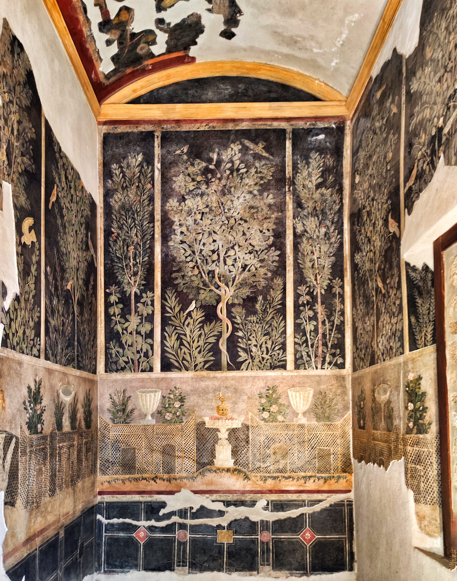 Dicevo, i cubicoli sono due. Il primo è più naturalistico, mi si consenta il termine: le piante si trovano in un giardino, il colore di sfondo evoca l’azzurro del cielo, sembra di stare all’aria aperta e la pittura, nelle sue dimensioni più ristrette, ricorda molto da vicino una pittura con analogo soggetto molto più famosa, proveniente dalla Villa di Livia a Prima Porta esposto al Museo Nazionale Romano di Palazzo Massimo alle Terme a Roma.