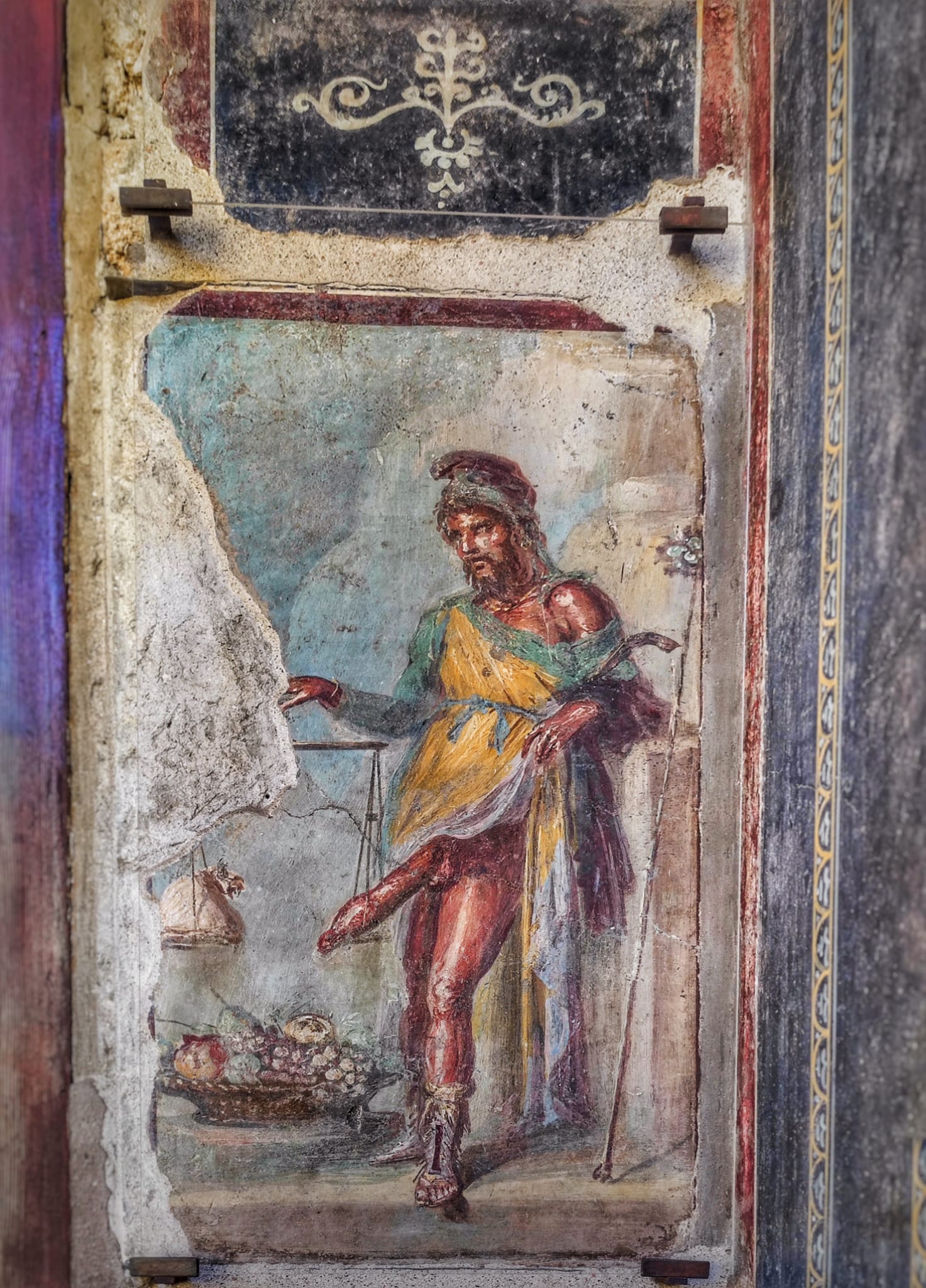 Stupenda. Non ho altre parole per definirla. Per raggiungere la Casa dei Vetti bisogna abbandonare Via dell’Abbondanza e inforcare una traversa che di isolato in isolato si restringe fino ad arrivare all’ingresso della casa, dove un Priapo particolarmente esuberante ci invita a entrare.