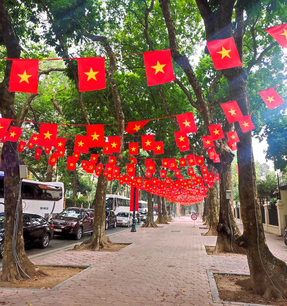 Bandierine, bandierine rosse ovunque. Bandierine con la stella gialla a cinque punte – la bandiera vietnamita – e bandierine con la falce e martello – simbolo del Partito Comunista al potere. Bandierine che sono attaccate, come fossero stelle filanti, tra gli alberi dei viali di Hanoi, muovendosi al vento e facendo festa. Bandiere agli angoli delle strade, bandiere agli incroci.