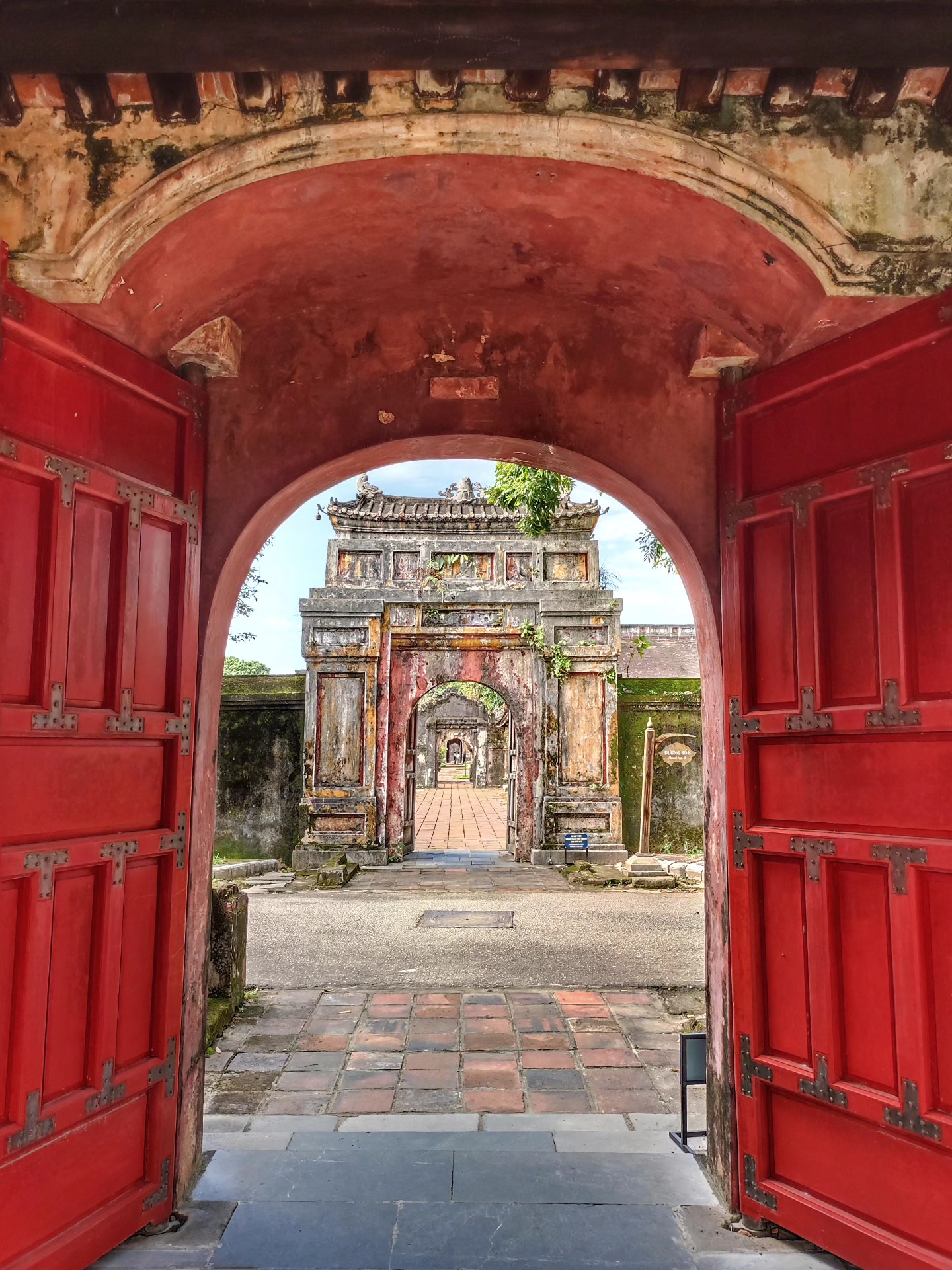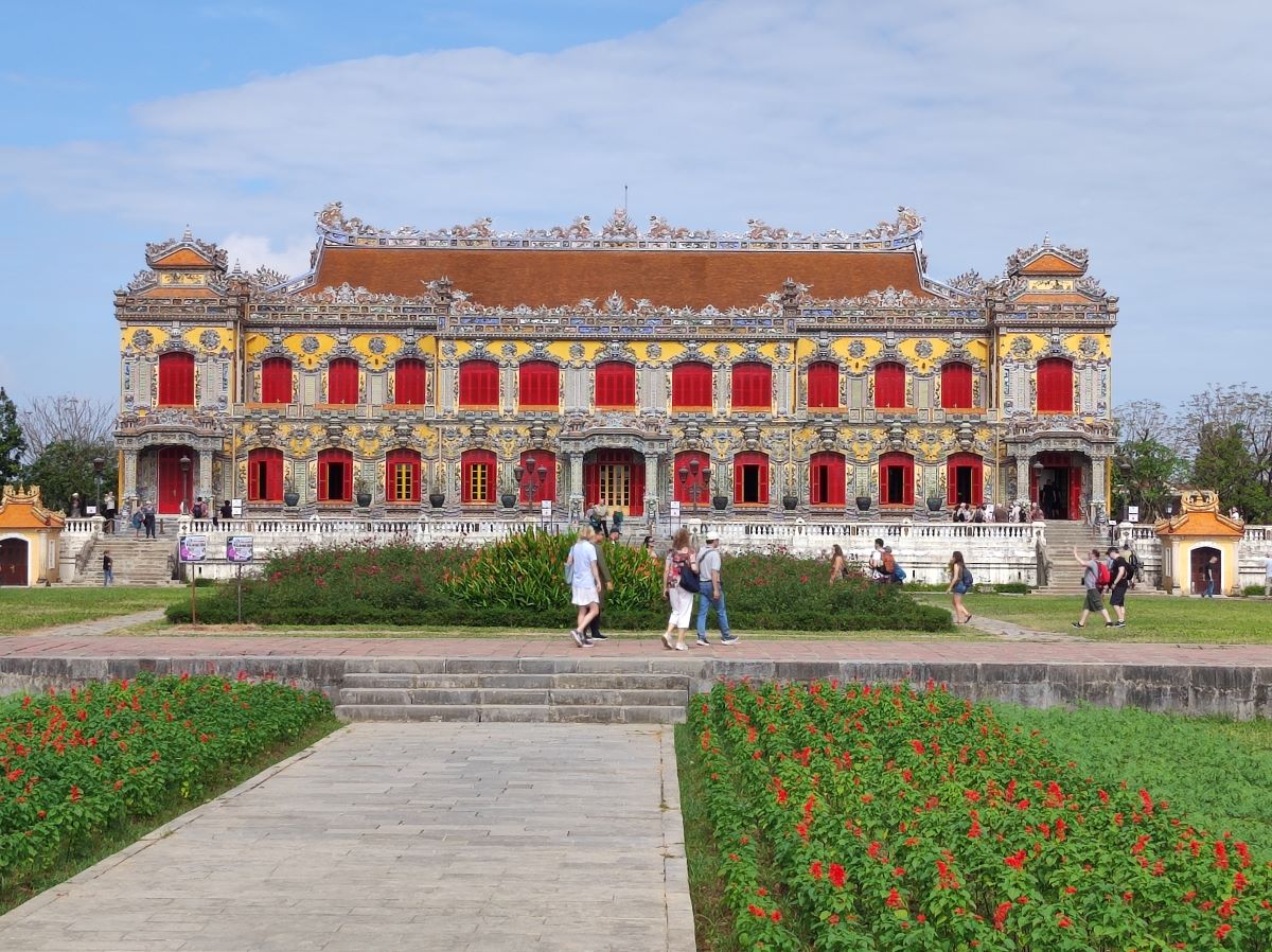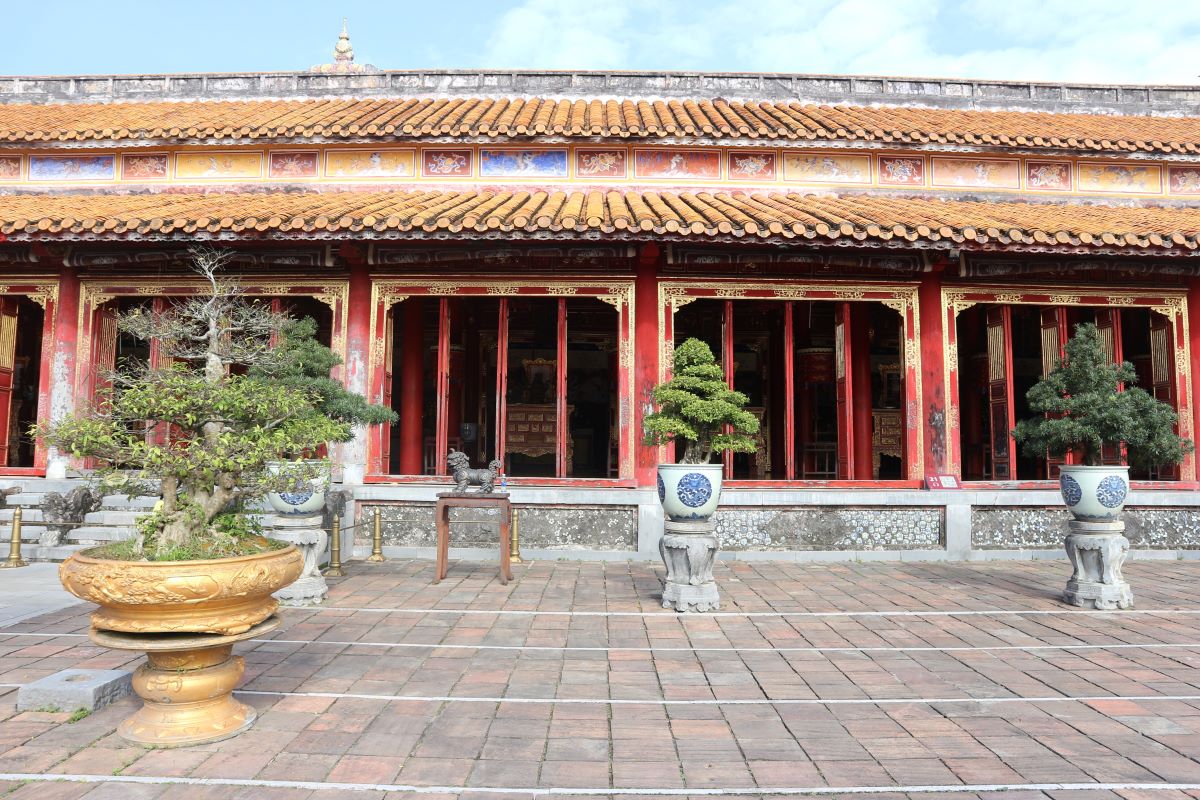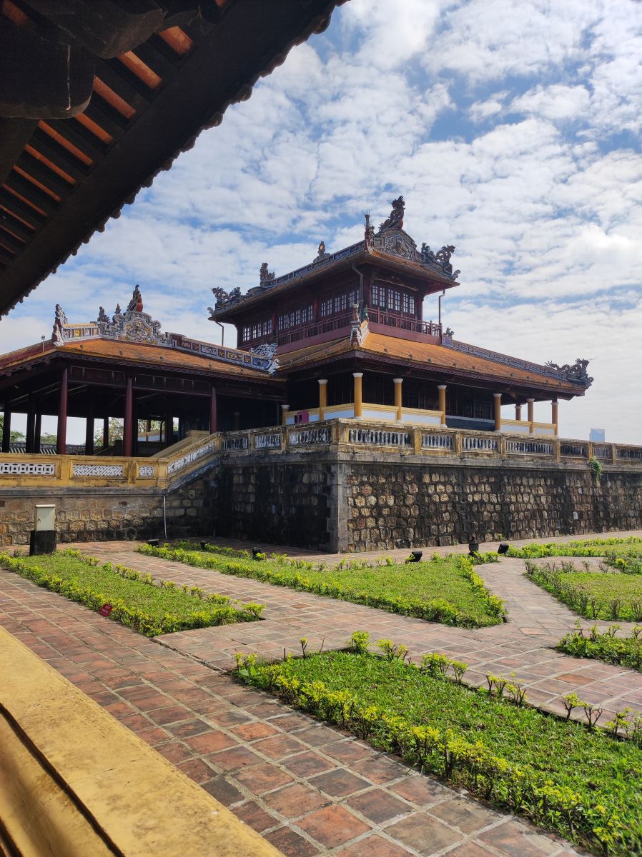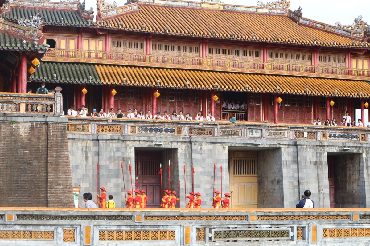 La visita al complesso monumentale inizia proprio dal luogo in cui si è appena svolto il cambio della guardia, Ngo Mon Gate, con le sue tre porte, delle quali solo la centrale, gialla – colore simbolo del potere – era quella utilizzata dall’imperatore. Al di sopra della porta, un loggiato era il punto da cui l’imperatore si mostrava in pubblico in rare occasioni cerimoniali.
