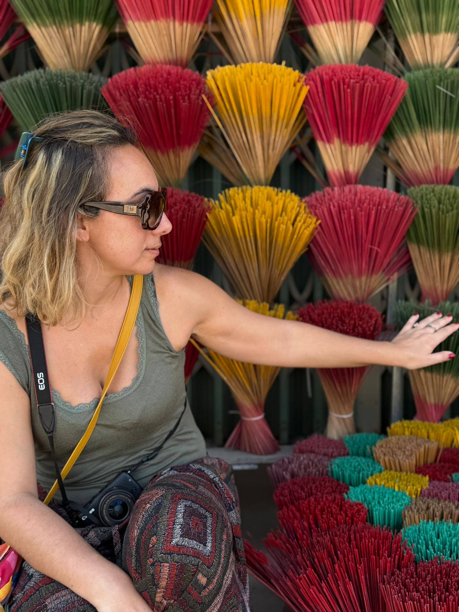 Lungo la via, già fuori città, che collega Hue con il mausoleo di Tự Đức si incontra una serie di bancarelle e di padiglioni che rivendono incensi coloratissimi a ciuffi. E’ il cosiddetto villaggio degli incensi. In realtà non molto più di una serie di rivendite di incensi, qui prodotti artigianalmente, insieme ad altri souvenir. Un luogo acchiappaturisti, senza dubbio. Però quei ciuffi di incenso variopinti sono davvero instagrammabili e bellini. E se le fanciulle vietnamite in Áo dài si fanno i selfie davanti ai monumenti, chi sono io per non cedere alla tentazione di una foto immersa in questi colori?