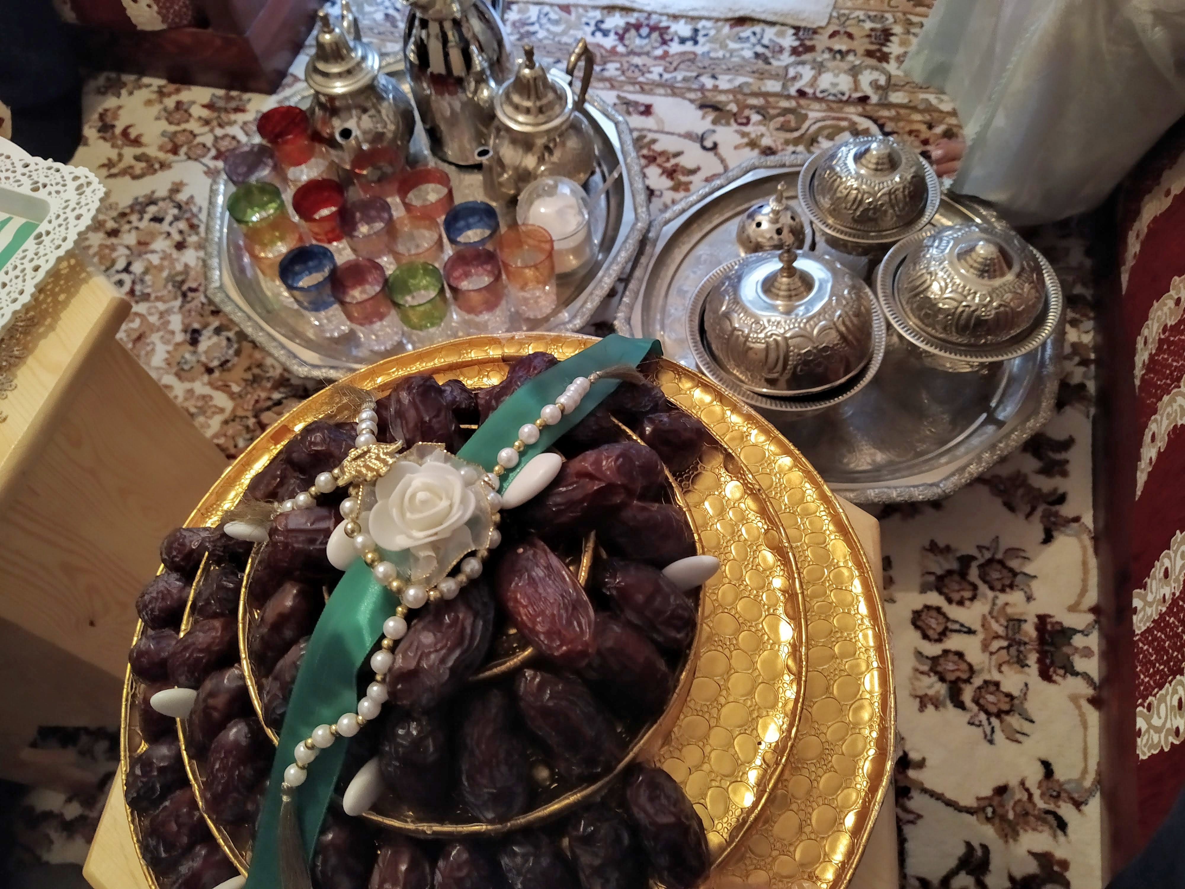 Verso le 22 arriviamo alla sala da cerimonie nella quale si svolgerà la festa. Una vera e propria sala da matrimoni in piena regola, fatta di luci, di fasto e di colore. Al nostro ingresso ci accolgono alcuni figuranti in costume; quando entriamo ci vengono offerti datteri e un bicchiere di latte: segni di buon augurio.