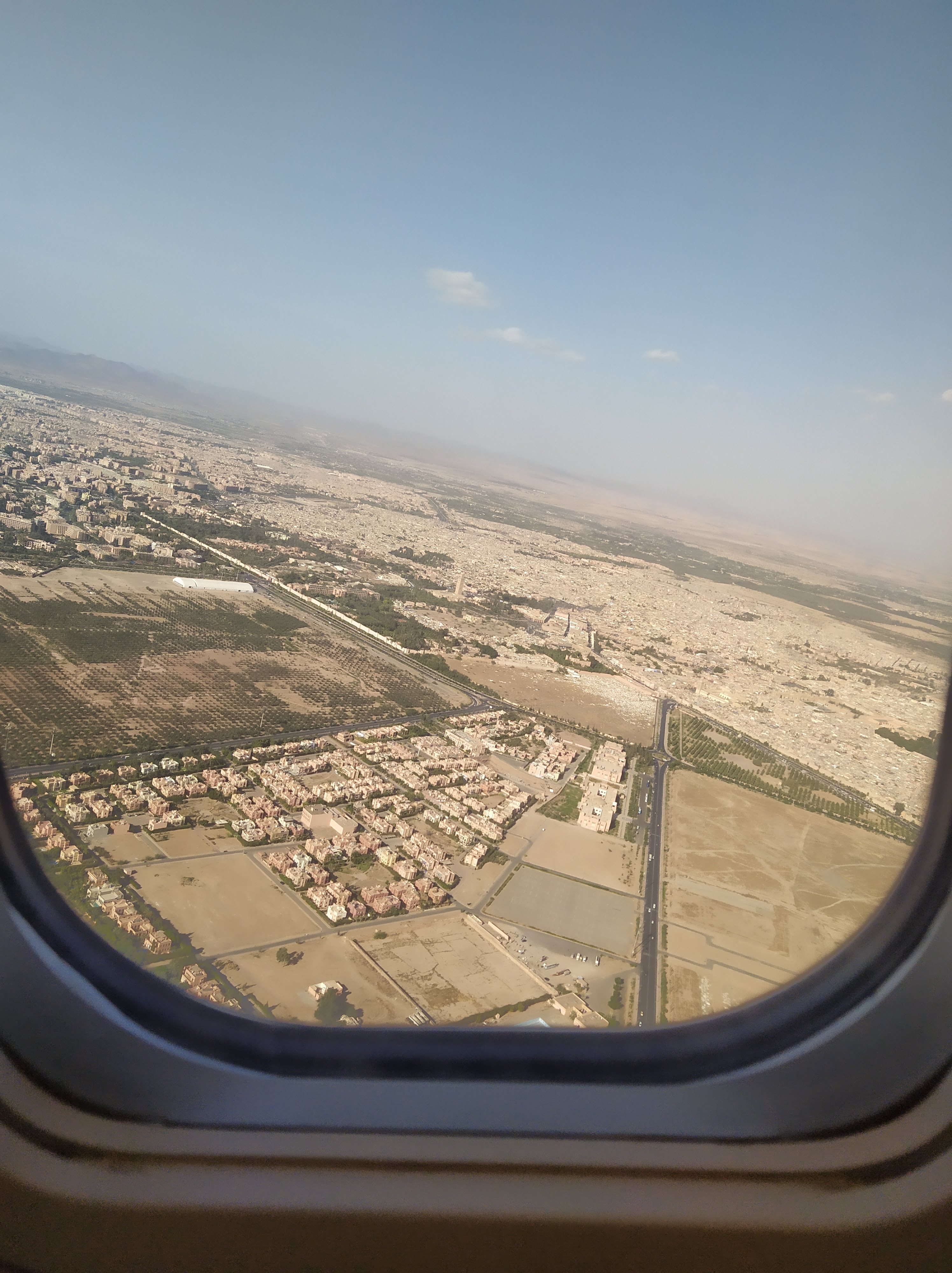 L’aeroporto non è così distante dal centro di Marrakech. Alzandosi in volo si vede distintamente il Jardin de la Menara col suo bacino acqueo e il suo oliveto ordinato, poi si sorvola la città vecchia, cinta dalle mura. Dall’alto si vedono anche i numerosi ampi giardini. La sensazione di una città che voglia strappare al deserto terra da antropizzare o, meglio, da ordinare ed educare, è ancora più evidente mentre decolliamo.