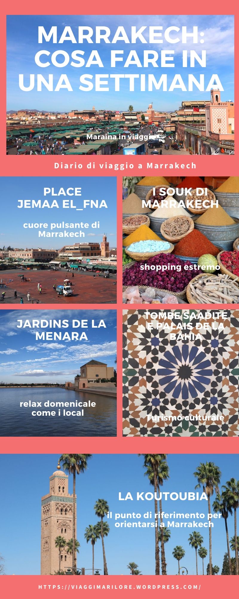 Sono stata a Marrakech per una settimana. Ho avuto modo di vivere delle esperienze veramente local: ospite a casa di un’autentica famiglia marocchina; ho avuto modo di bere il té alla menta con loro, di mangiare il couscous fatto in casa, ho avuto modo di farmi il tatuaggio all’henné su entrambe le mani, ho avuto modo di attraversare i souk senza perdermi grazie alla guida di un amico di Marrakech; ho avuto modo anche di visitare alcuni tra i monumenti e giardini più importanti della città. Infine, ho avuto modo di fare una gita fino ad Essaouira. In questa infografica riassumo brevemente i must do di Marrakech. Il bello della narrazione comincia col prossimo capitolo.