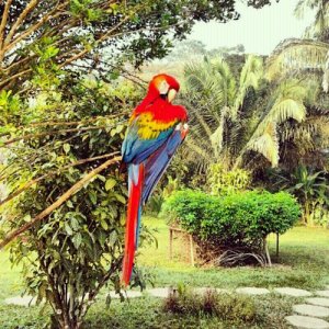 Il nostro Lodge, il Corto Maltes, si trova lungo le rive del Rio Madre de Dios, a ½ ora circa da Puerto Maldonado. Siamo in un bungalow protetto da zanzariere, con zanzariere a protezione del letto. Gli insetti sono molto abbondanti in effetti. Facciamo subito la conoscenza con gli uccelli del parco del lodge: un’ ara ararauna, grosso pappagallo blu e giallo, 2 ara cloroptera, rosse con le piume della coda variopinte, un piccolo tucano, tenerissimo, la mascotte del lodge, e gli uccelli oropendula, neri dalla coda gialla che costruiscono nidi che sono opere d’arte, vere case sull’alto albero che le ospita.