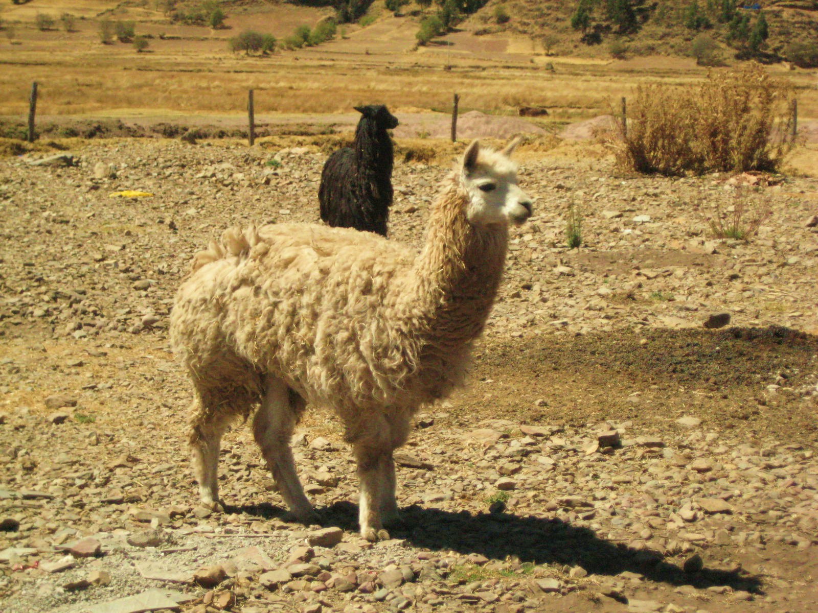 Il sito archeologico è sull’altura, e durante la salita, a piedi, incrociamo un gregge di alpaca guidato da una bambina che ci chiede un sol per poter fotografare. È il prezzo da pagare, ma vale il prezzo del biglietto la possibilità di passare in mezzo al gregge: non sono più grossi delle pecore, solo hanno il collo lungo e l’espressione sorridente. Qualcuna ha gli occhi azzurri.