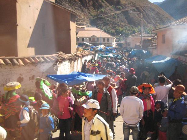 Riprendiamo il cammino, che ora costeggia un fiume, il Rio Urubamba, che nasce nelle Ande, attraverserà poi la Valle Sacra degli Inca per andare a buttarsi, molto più avanti, nel Rio delle Amazzoni. Aumentano i villaggi, che sono sempre più grandi: a Occobamba è in corso la festa patronale di Santa Rosa, tutta la popolazione è in festa e in abito tradizionale.