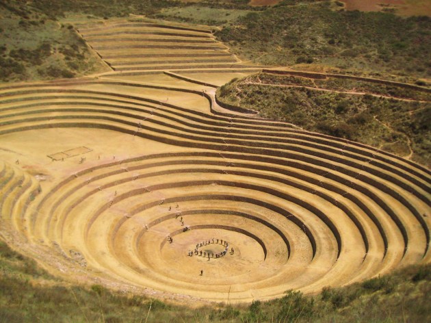 Dopo questo stop a Chinchero ripartiamo con destinazione Moray. Qui l’impatto visivo è fortissimo: gli Inca hanno utilizzato i pendii di un antico lago prosciugato e le sue adiacenze per creare delle andenes, dei terrazzamenti curiosamente circolari. Dall’alto sembrano tanti cerchi concentrici che vanno riducendosi man mano che si scende. La perfezione è assoluta. Scendiamo con fatica diverse andenes fino ad arrivare nel centro; ma la risalita è peggio: perché per salire e scendere dai terrazzamenti gli Inca non fecero comodi gradini, ma preferirono sistemare delle pedarole, pietroni posti di piatto che fuoriescono dal terrazzamento a mo’ di scala. Gioco di equilibrio e di gambe, per noi intrepidi e atletici viaggiatori.