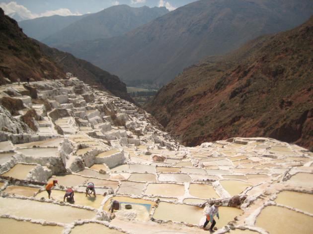 Le saline di Maras sono uno spettacolo. Utilizzate sin da epoca Inca, occupano il fianco di una montagna che affaccia sulla valle del fiume sacro Vilcamayu, o Vilcamota, o Urubamba, a seconda di quale dei suoi tre nomi, Inca o Quechua, si voglia utilizzare. Da una piccola fonte di acqua salata – salata per motivi geologici che arretrano nel tempo fino al distacco della Pangea e alla formazione del Sudamerica – scende un ruscello la cui acqua viene deviata in vasche di decantazione successive che occupano tutto il pendio, dove l’acqua si ferma ed evapora, rilasciando al suo posto il sale bianchissimo, la cui luce abbacina a quest’ora, mezzogiorno circa. L’impatto visivo anche in questo caso è fortissimo perché le saline sono molto estese, arrivano fino a valle, mentre noi siamo sulla parte sommitale di esse. Un gruppetto di persone sta raccogliendo il sale in una delle vasche: una lo raggruppa con una pala, un altro lo prende in un setaccio, lo filtra dell’acqua in eccesso e lo butta su una montagnola già formata dove il sale si può essiccare. Mestieri che non è facile incontrare al giorno d’oggi.