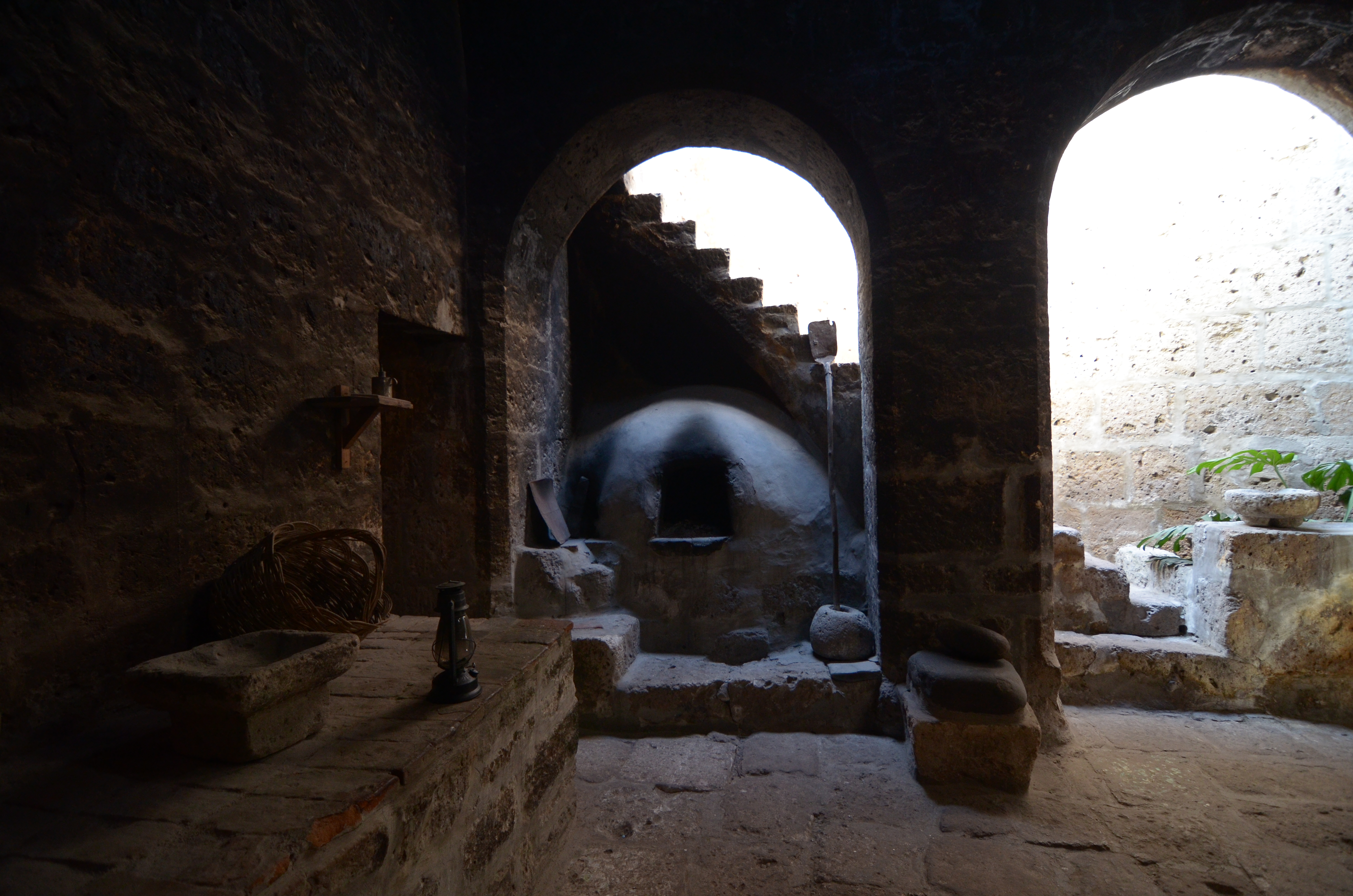 Per evitare l’eventuale ressa dei turisti ci presentiamo appena dopo l’apertura e infatti, almeno per la prima parte, il monastero è tutto per noi. La visita consente di ammirare i chiostri e le celle, più simili ad abitazioni, delle suore. Le pareti esterne hanno colori vividi, rosso e blu, mentre tutto è costruito nella tipica pietra bianca vulcanica locale, il sillar. Tra chiostri, vie e celle, sembra di essere in una città nella città, e così doveva essere nei secoli scorsi. Nelle celle spesso è ricostruito l’arredamento e molto suggestive sono le cucine, dai caratteristici forni a cupola, le pareti annerite e il comignolo sul tetto. A proposito di cucine, molto grande era quella, ricavata in una cappella precedente, che al suo interno ospita anche un pozzo.