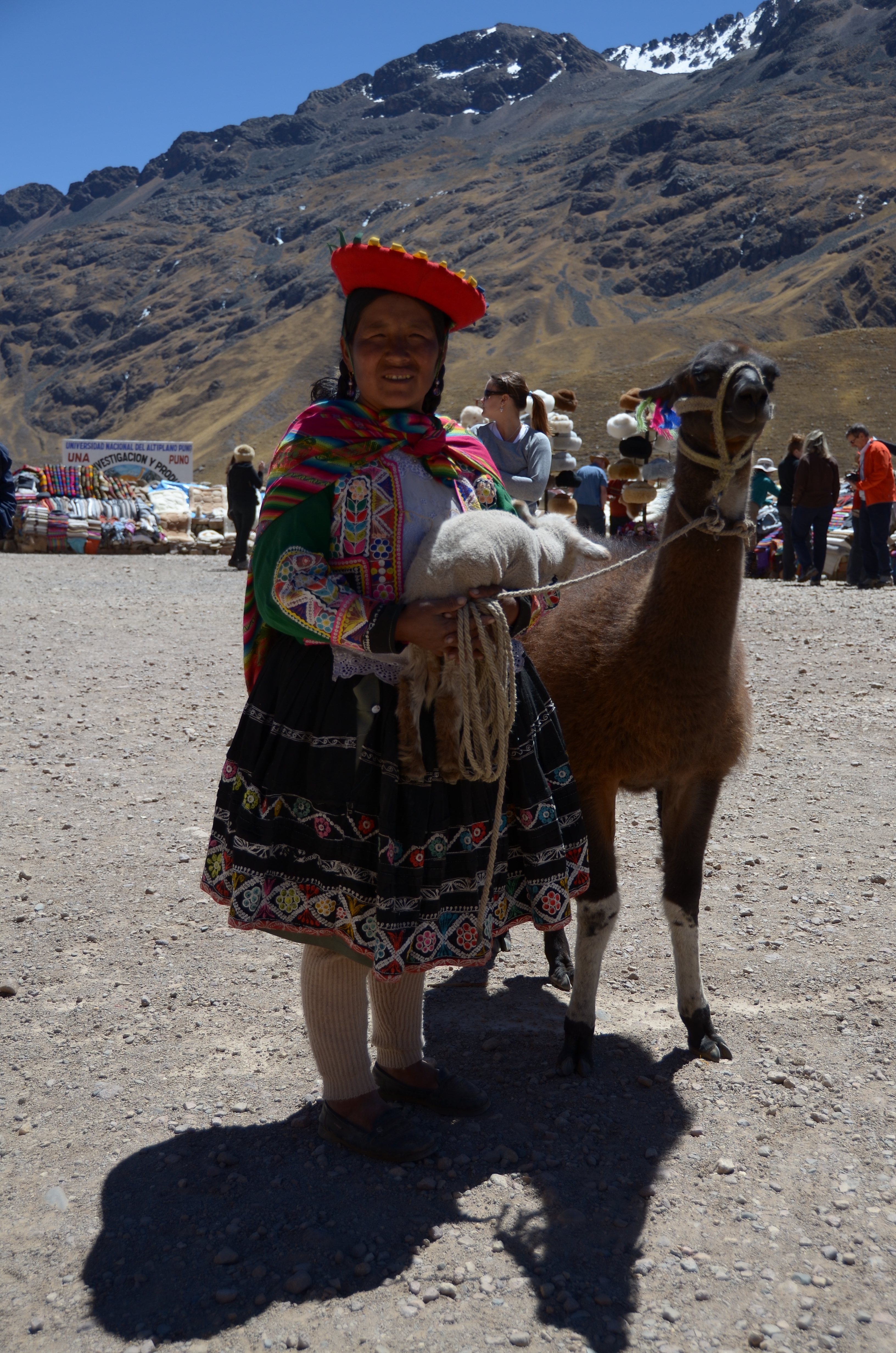 Man mano che si sale di altitudine l’antropizzazione già scarsa diminuisce. La nostra seconda tappa è il punto più alto della strada, a 4300 m slm, che guarda al ghiacciaio Chiribamba. Siamo davvero in mezzo alle Ande. Qui al belvedere è allestito un piccolo mercato in funzione turistica, compresa una signora in abito tradizionale con bambino in groppa sulla schiena, cucciolo di alpaca in braccio e alpaca accanto, per farsi fotografare e spillare così 1 sol ai turisti.